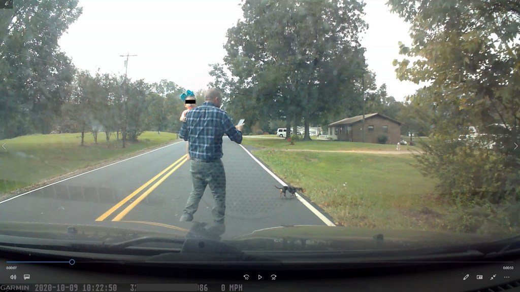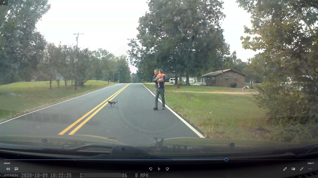 10:39 – The county deputy finally arrives, I’d been sitting in the car at the side of the road. The toddler was out of sight by now. It was an awkward wait for the police, since I told the woman I had notified them. I showed the officer my dashcam video and gave him my information.